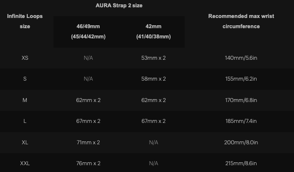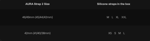 AURA Strap 2 comes in two sizes, 42mm (38/40/41mm) and 46/49mm (45/44/42mm).