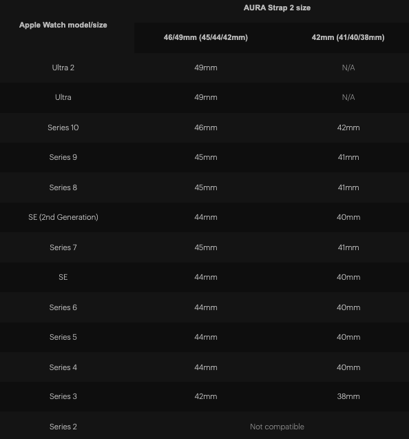 When selecting your AURA Strap 2, please ensure you choose the correct size based on your Apple Watch model.